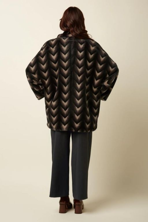 El abrigo kimono Shiya Deco Fur combina un sofisticado cuello de solapa con elegantes mangas 7/8 y un llamativo estampado en zigzag. Este abrigo forrado cuenta con prácticos bolsillos en la costura y un cierre de botón para un acabado refinado. La lujosa piel sintética aporta calidez y textura, lo que lo convierte en una opción refinada para combinar con otras prendas con estilo.
