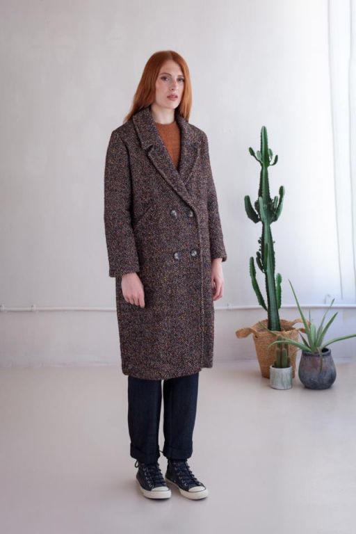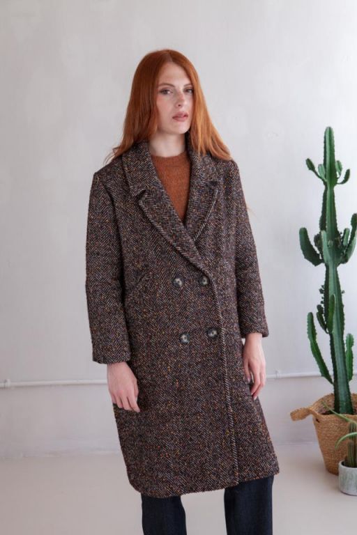 Abrigo midi en tejido con textura, cuello solapa, doble botonadura y bolsillos delanteros.