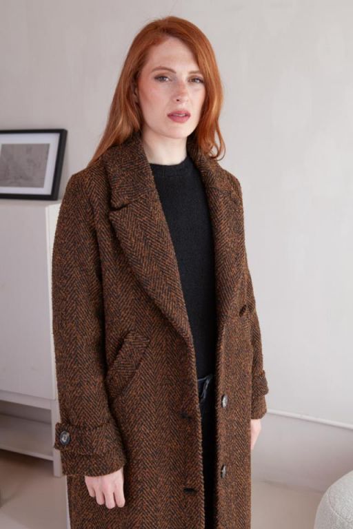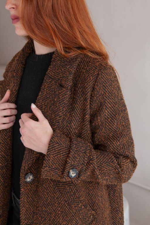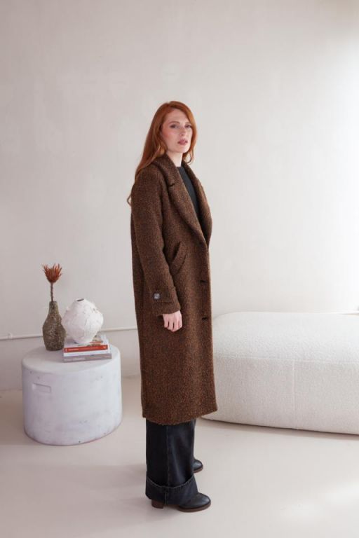 Abrigo largo en tejido con textura, cuello solapa, trabillas en mangas y bolsillos en el delantero.