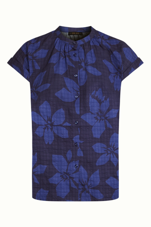 Camisa floral con escote redondo, mangas cortas y cierre de botones.
