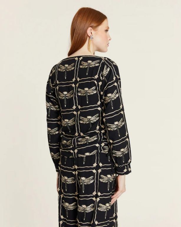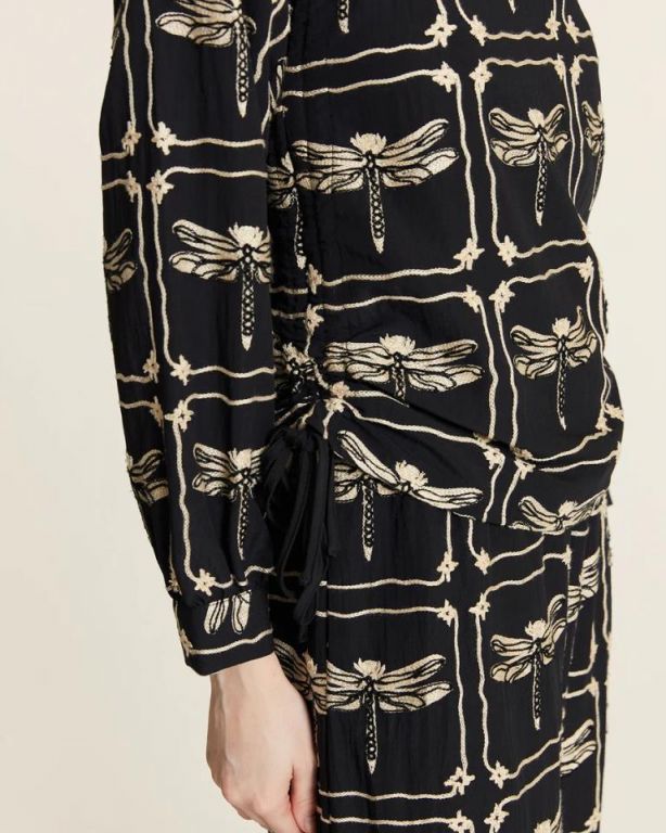 Blusa con bordado de libélulas, mangas largas rectas con puño abotonado y largo a la altura de la cadera.