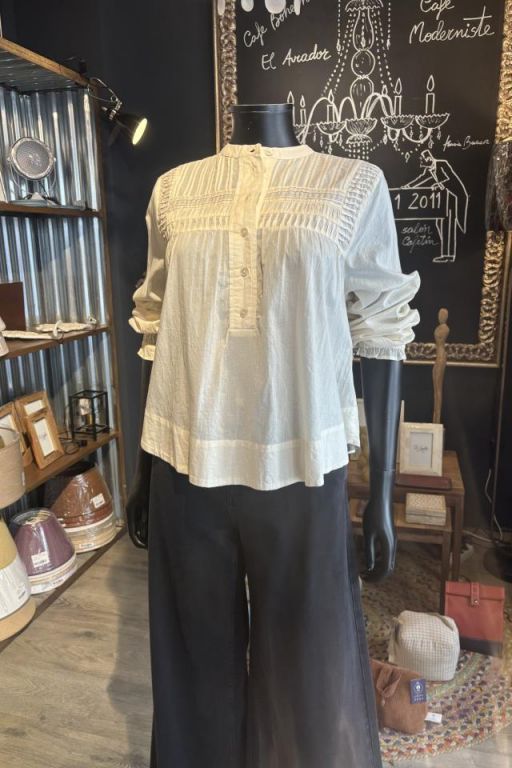 Costuras en la parte superior y los hombros que le dan estructura. Mangas largas con puños elásticos. Corte holgado y vaporoso.