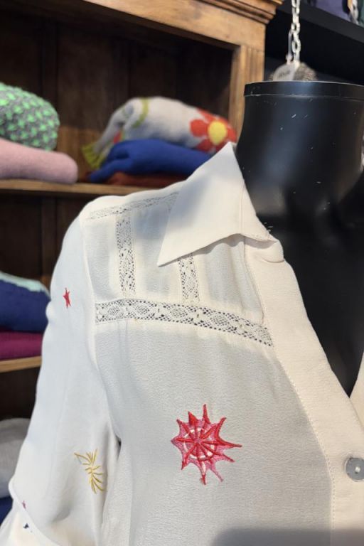 Blusa con encaje en la zona del cuello y decoración por toda la blusa.