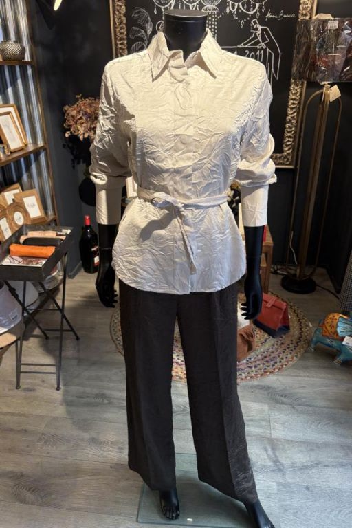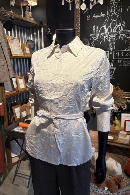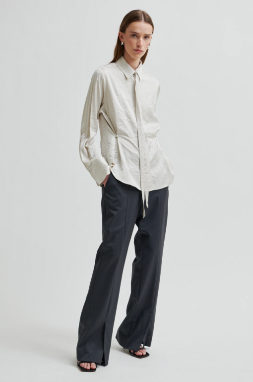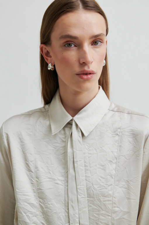 Camisa arrugada Second Female. Confeccionada en una mezcla de viscosa drapeada con estructura arrugada. Cuello clásico y cierre de botones ocultos. Botones delanteros que realzan la silueta. Lazo desmontable en el cuello. Ajuste ajustable.