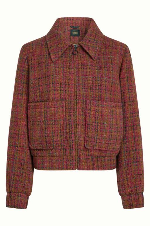 La chaqueta tiene mangas largas con puños, cuello clásico y cremallera corta.