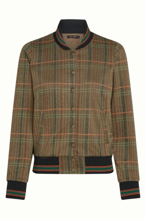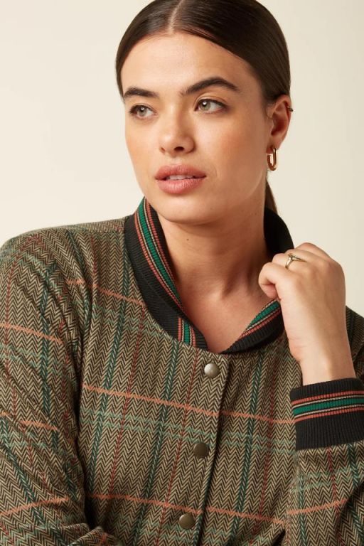 La chaqueta presenta un diseño a cuadros con cuello de punto y mangas largas con puños. Confeccionada en jersey elástico.