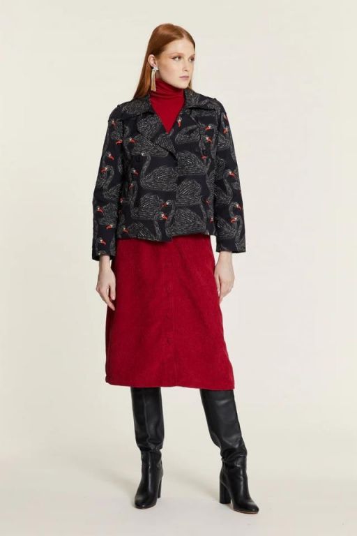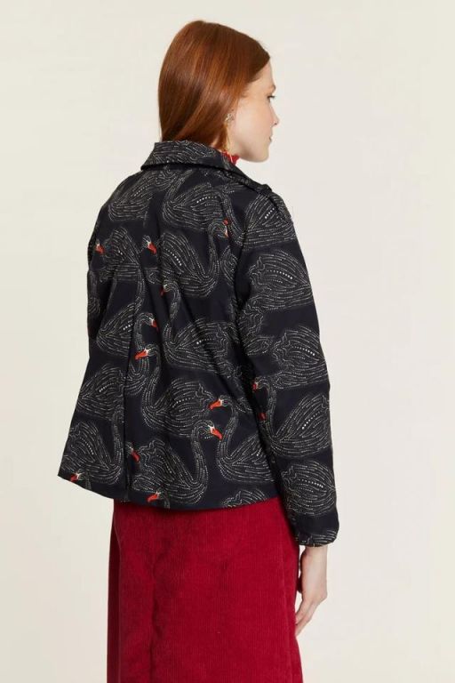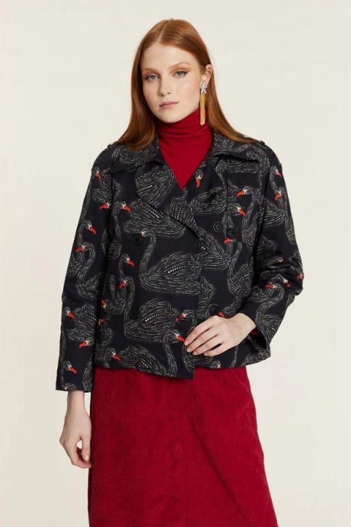 Chaqueta corta con estampado de cisnes, forro acolchado, cuatro botones, mangas ángel y solapa redondeada tipo peak.