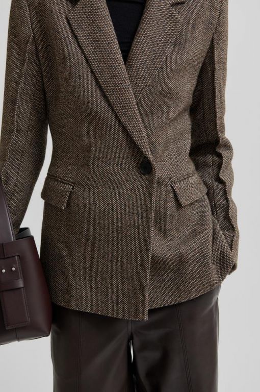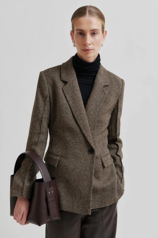 Blazer de tweed a medida de Second Female. El blazer está confeccionado en una mezcla de lana con estampado de tweed. Presenta solapa de muesca y cierre de botones descentrados. Hombros acolchados y mangas largas con detalles de costuras y aberturas en los puños. Dos bolsillos con solapa y abertura en la espalda. Totalmente forrado. Corte ajustado y contorneado.