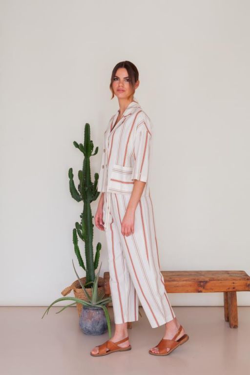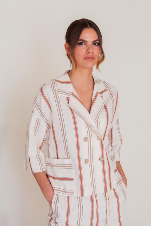 Chaqueta corta cruzada y de corte recto, con bolsillos en el delantero y manga francesa.