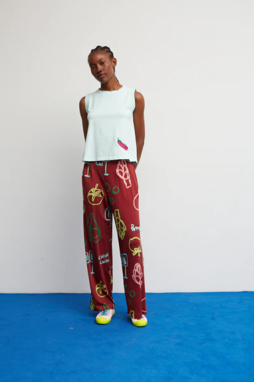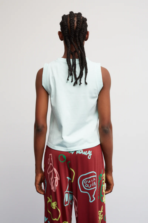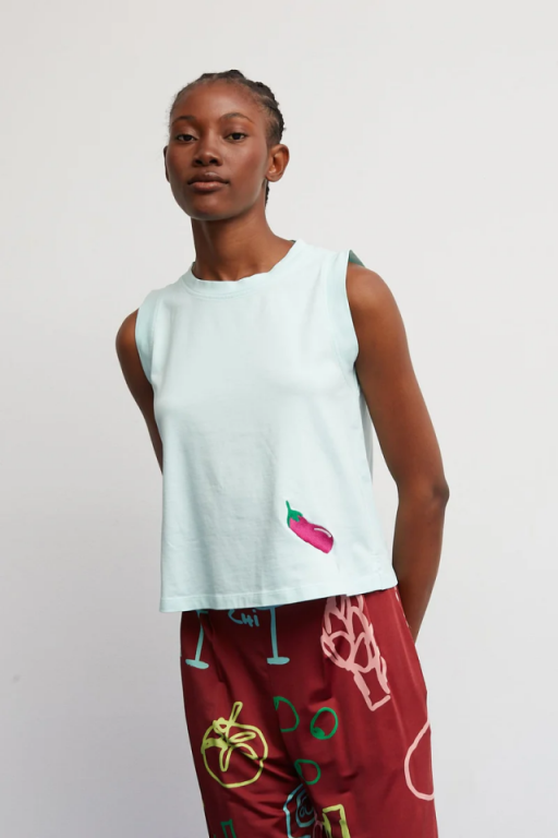 Camiseta sin manga , de corte recto con cuello redondo y bordado con una berenjena en el bajo .