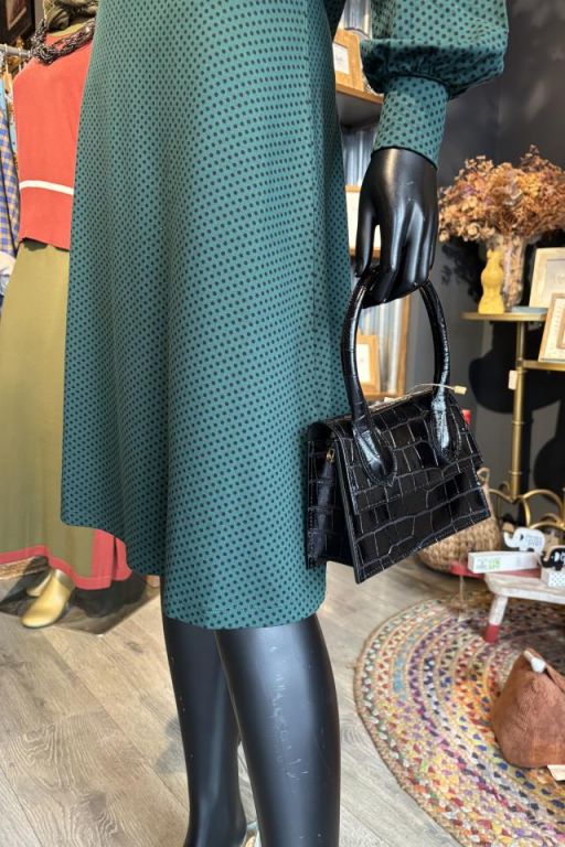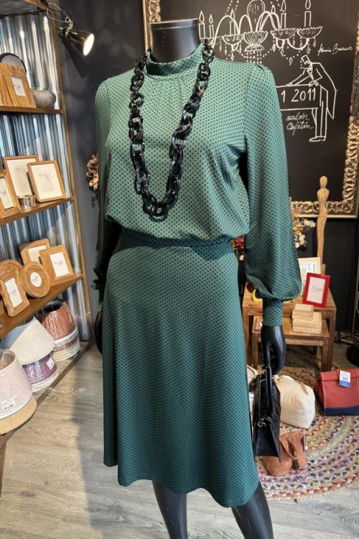 Esta falda de talle medio, presenta una fina cintura elástica y un diseño midi acampanado, confeccionada en punto de viscosa elástico con un estampado de lunares para un look cómodo y elegante.