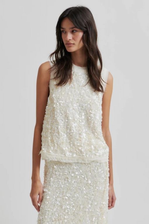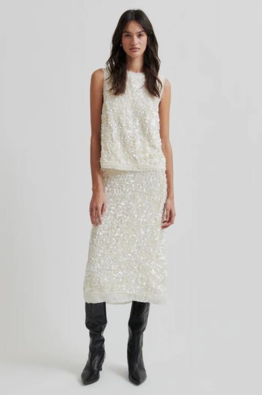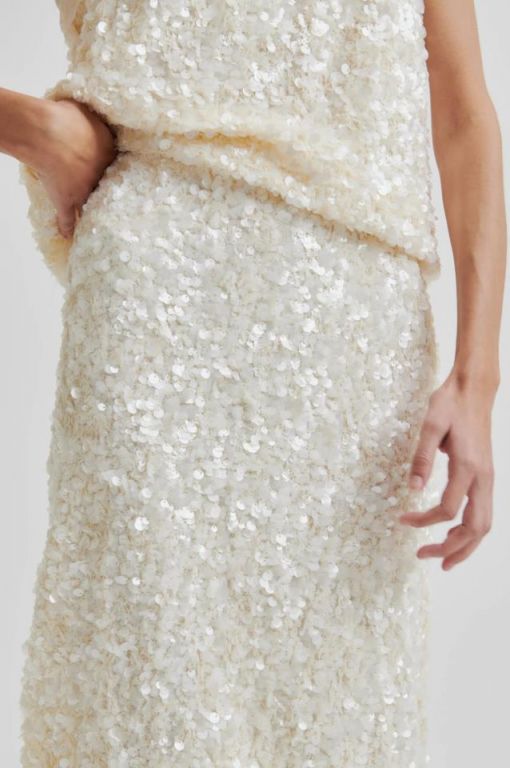 Falda lápiz de lentejuelas y una cintura elástica cubierta. Forro visible en el dobladillo. Abertura en un lateral. Totalmente forrada. Corte recto y ajustado.