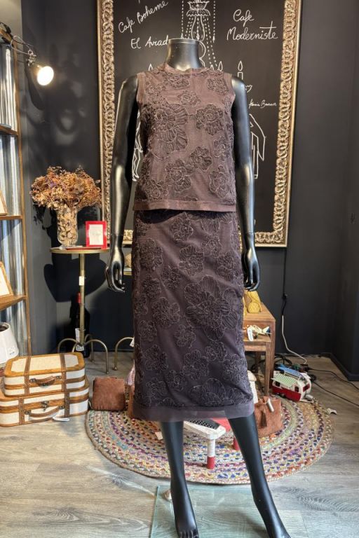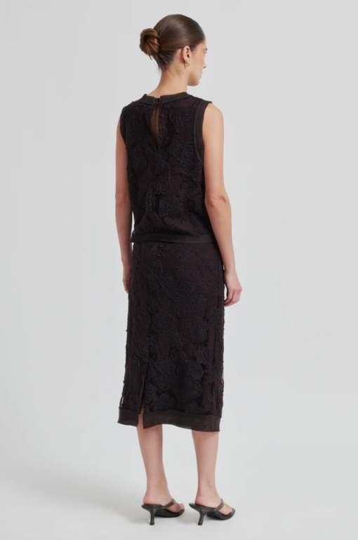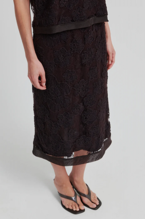 La falda consta de una capa de encaje y flores estructuradas sobre una capa lisa. Cuenta con cierre de cremallera oculto en la parte trasera y cinturilla elástica fina. Detalles de tejido en contraste y bajo sin rematar. Corte recto.