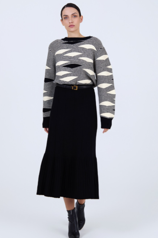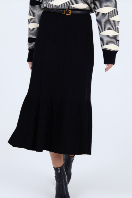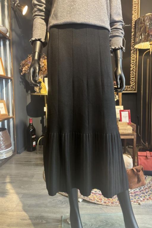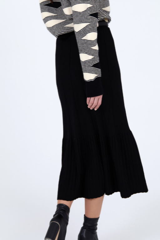 FALDA MIDI DE PUNTO CON MEZCLA DE VISCOSA. VOLANTE BAJO CON PUNTO CANALÉ. CINTURILLA CON ELÁSTICO EN EL INTERIOR.