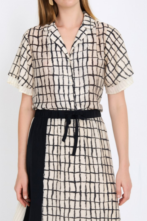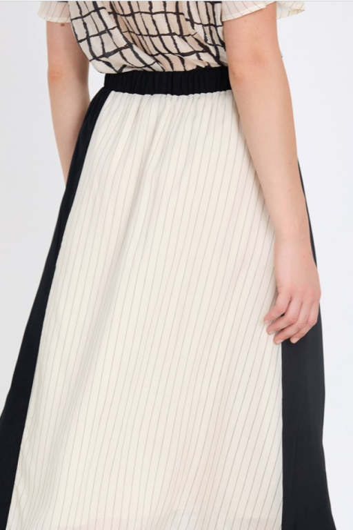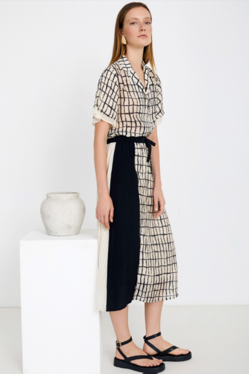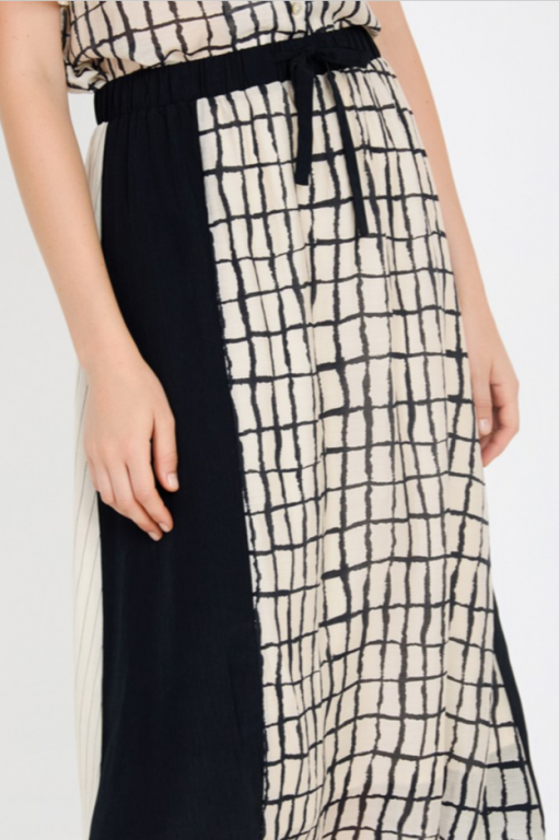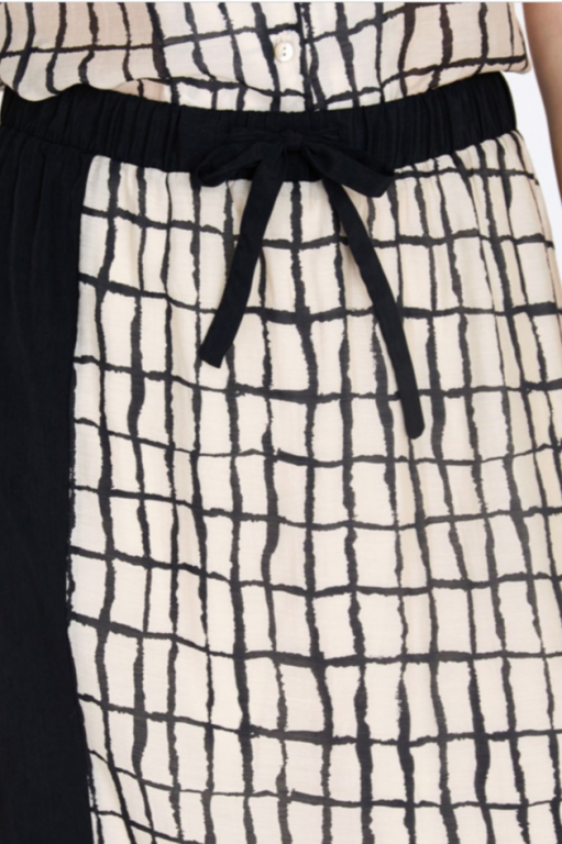 Falda midi en tejido combinado de tencel fluido con diseño tipo patchwor. Combinación de estampados de cuadros y rayas y un tejido liso. Cinturilla elástica y ajustable con lazo .