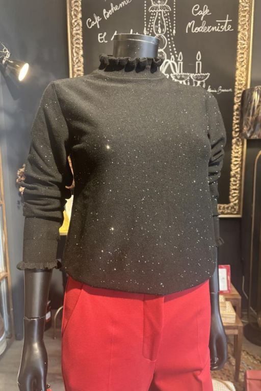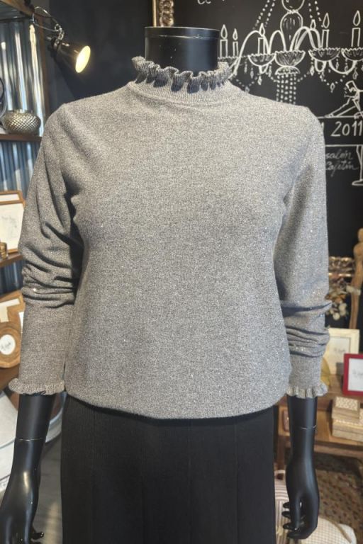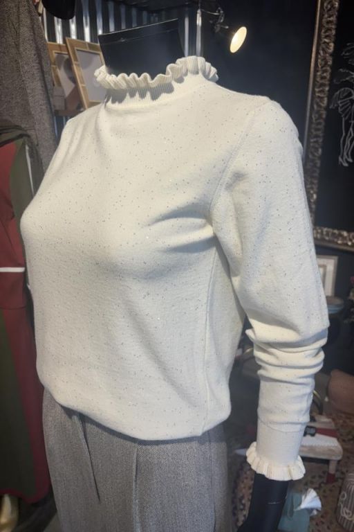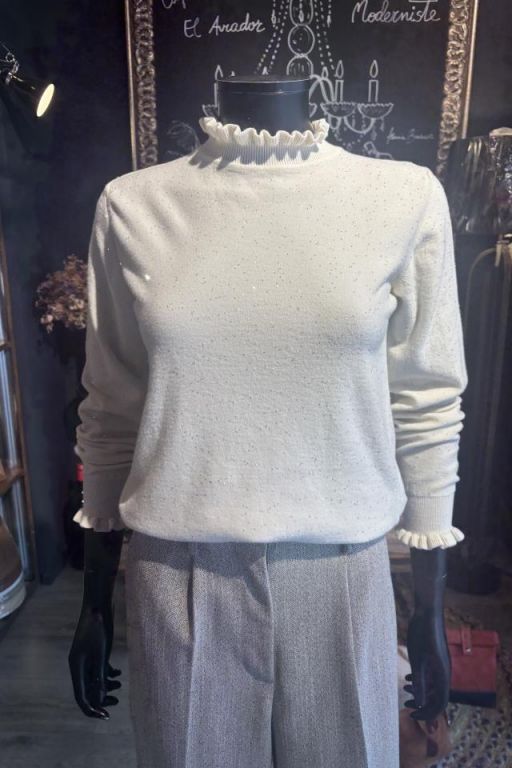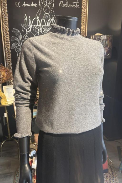 Jersey de cuello cisne de canalé en forma de volante y misma forma en el puño. Detalle de pequeñas lentejuelas en el tejido