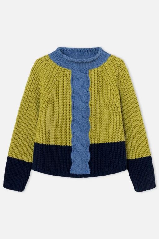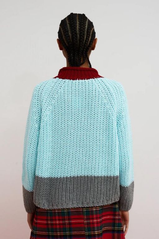 Jersey de punto, corte recto y manga reglán. Cuello chimenea color azul con trenza XL frontal, con la combinación de los tres tonos.