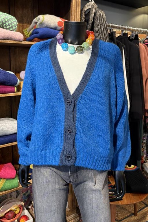 Cárdigan bicolor. Diseño corto de corte recto, con manga larga ranglán y cierre frontal de botones. Confeccionado en un tejido de punto ligero y muy suave al tacto.