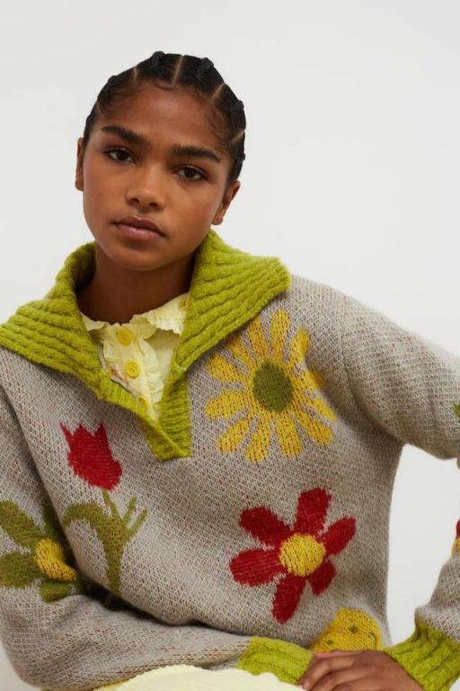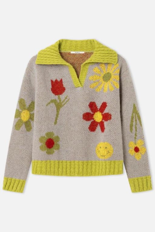 Jersey gris con jacquard de maxi flores en tonos amarillo, verde y rojo. Cuello marinero, corte recto y manga larga. Detalle de acabados en punto trenzado en puños, bajo y cuello.