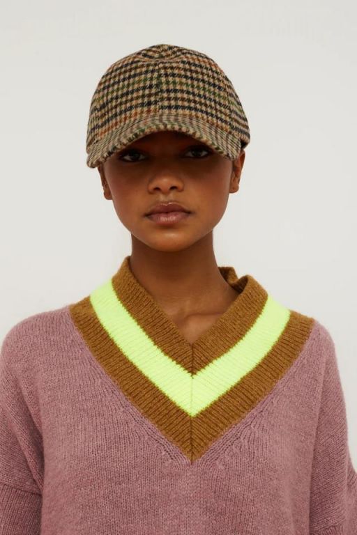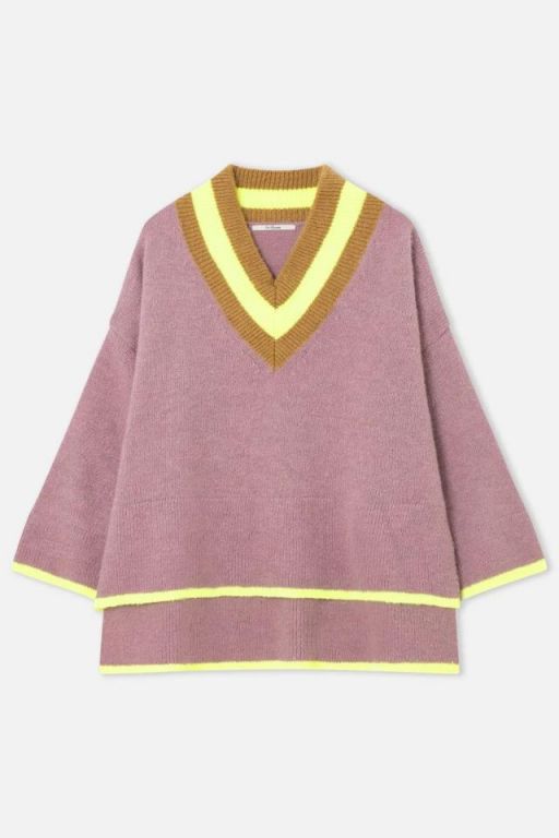 Jersey color rosa, de corte amplio con diseño oversize. Escote de pico rematado en canalé tricolor, en flúor y marrón, que aportan un contraste llamativo. Confeccionado en punto suave de tacto agradable