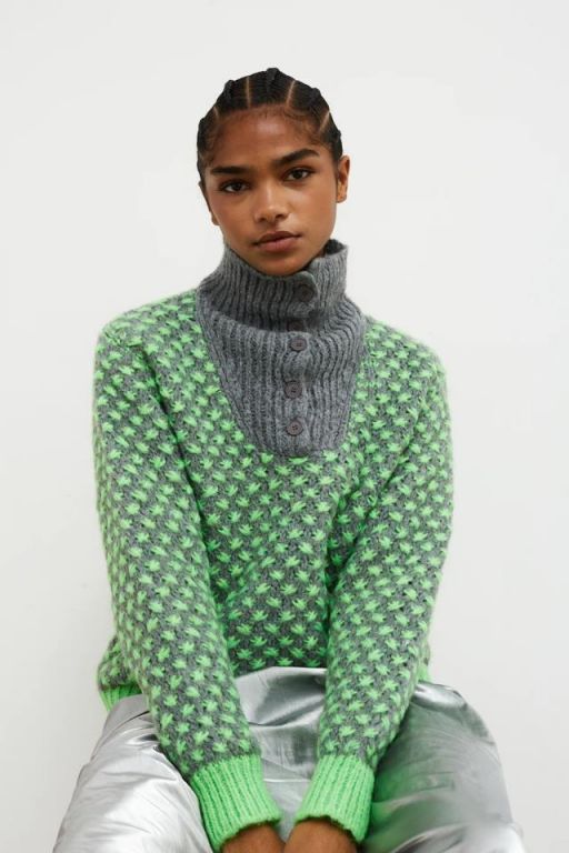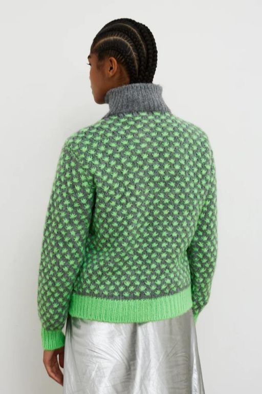 Jersey de corte recto con trama estrellada en color gris y verde. Puños y bajo rematados en canalé ancho de color verde. Detalle especial de cuello chimenea de canalé en punto grueso gris con cierre de botones frontal.
