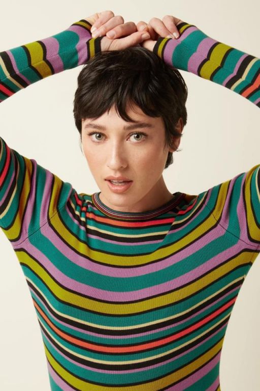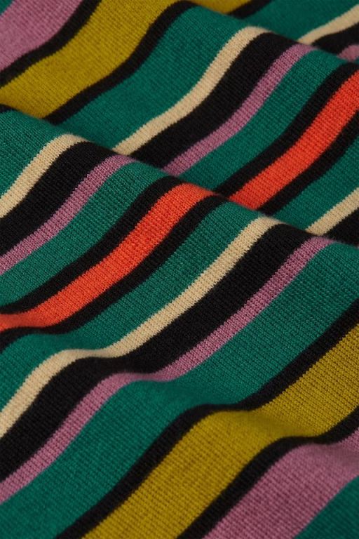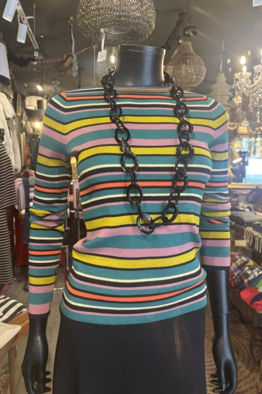 Este jersey presenta rayas divertidas, mangas largas y un cómodo escote redondo, perfecto para agregar un toque divertido a tu guardarropa.