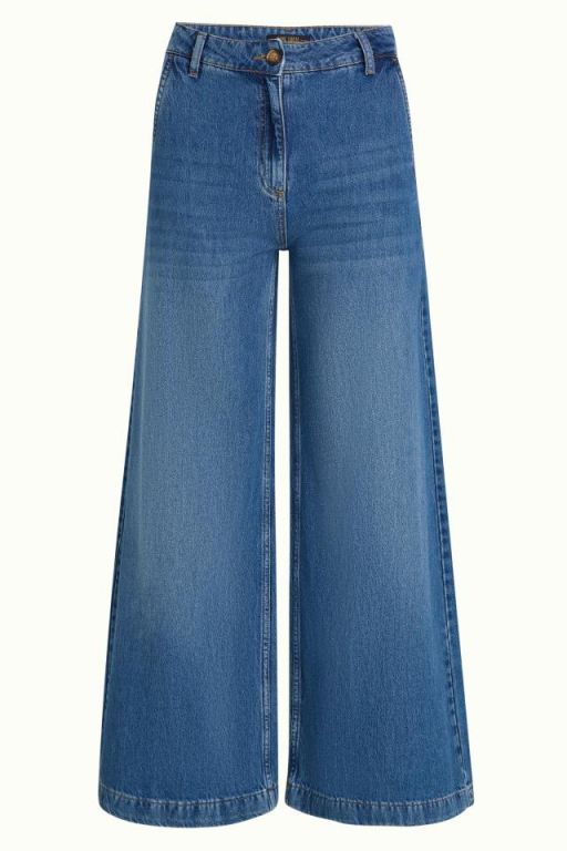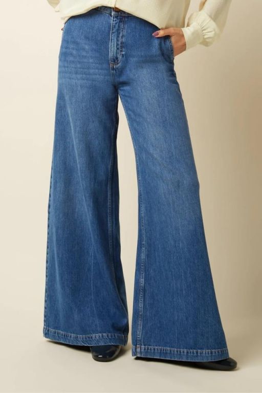 Pantalones de cintura alta, corte ajustado y perneras anchas para una silueta elegante. Con bolsillos inclinados, trabillas y cierre de botón y cremallera.