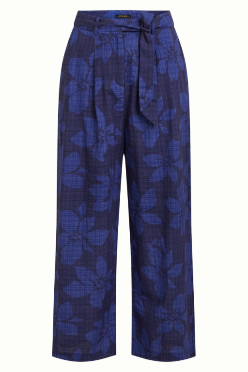 Pantalón floral de cintura alta, cinturón de lazo, bolsillos laterales y cierre con cremallera y gancho.