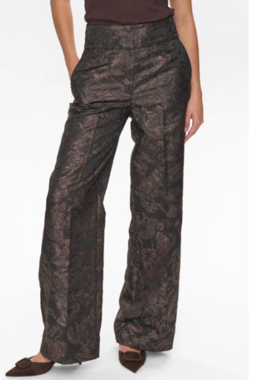 Pantalón de tiro alto, de tejido brocado en tono marrón oscuro con reflejos metálicos de pata ancha.