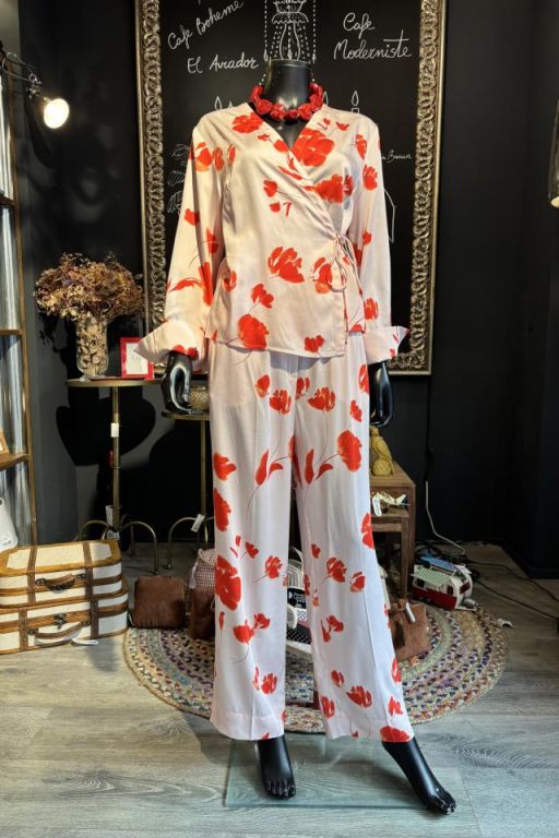 Pantalones florales confeccionados en una suave mezcla de viscosa y tencel l. Cintura elástica oculta. Bolsillos laterales y bolsillos traseros decorativos. Tiro medio con pernera ancha y holgada.