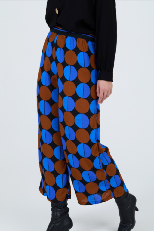 PANTALÓN CROPPED EN CREPE DE VISCOSA Y TENCEL CON EL ESTAMPADO DE CIRCULOS. DETALLE DE LOS BOTONES EN LA CINTURILLA. CINTURILLA CON TEJIDO DE CANALÉ Y RAYAS A CONTRASTE. CIERRE CON CREMALLERA LATERAL INVISIBLE.