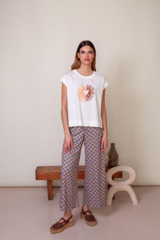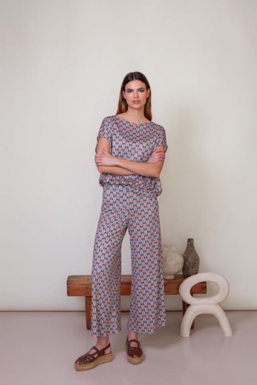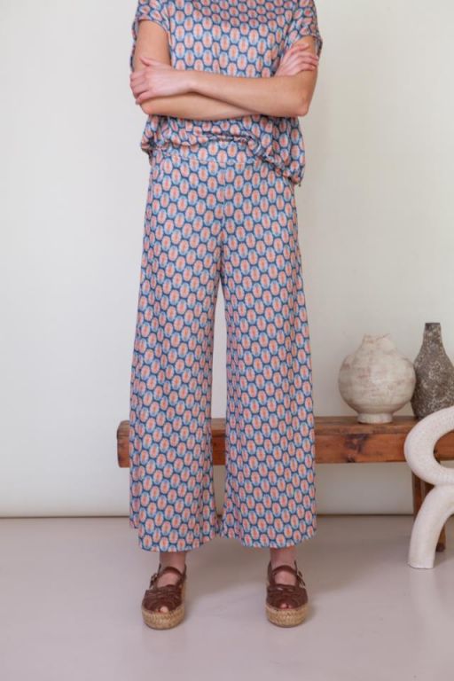 Pantalón ancho en tejido elástico con cinturilla de goma y bolsillos laterales.