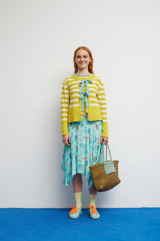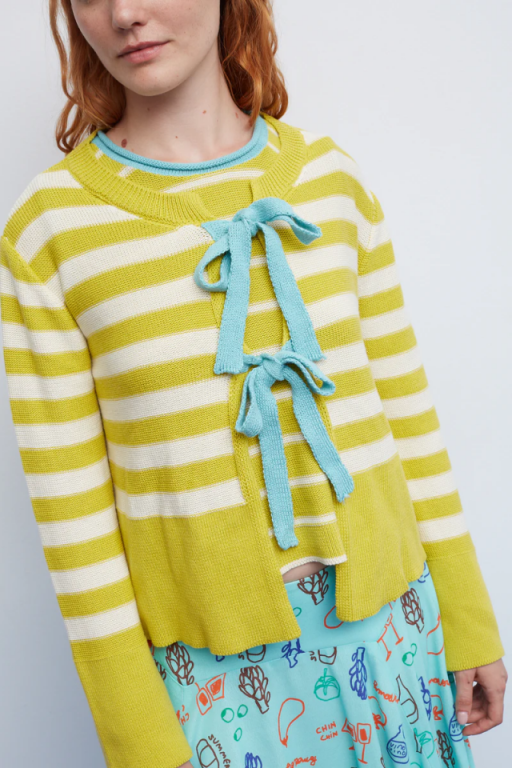 Chaqueta de punto a rayas en amarillo y crudo, con lazos frontales en tono verde agua, mangas ligeramente amplias en el puño y una silueta recta y corta.
