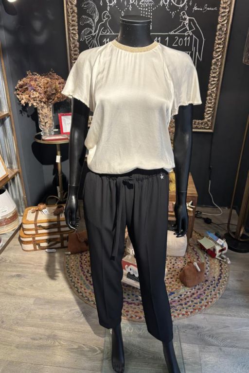 Top de manga corta en forma de volante con cuello a la caja de canalé con lurex dorado