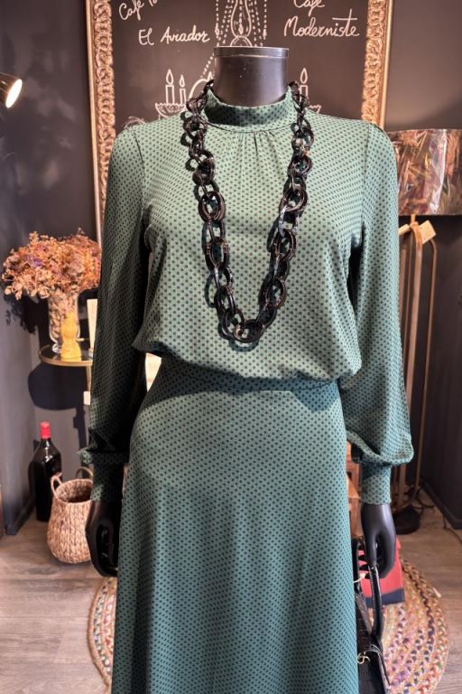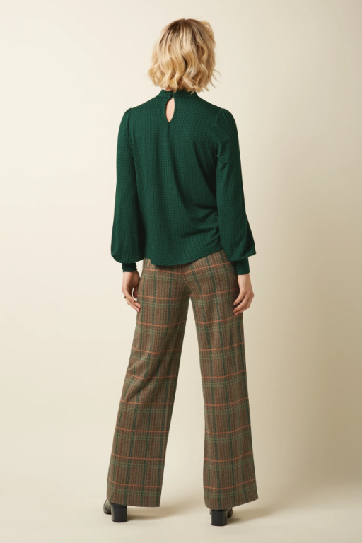 El top presenta un cuello alto con delicados pliegues en el escote para una silueta favorecedora. Confeccionado en viscosa elástica, su estampado de lunares le da un toque divertido. Las mangas largas terminan en cómodos puños, y el cierre de botón con abertura en forma de ojo de cerradura facilita su uso.