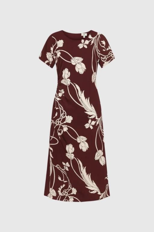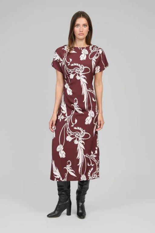 Vestido midi con cuello de barco , mangas caídas, tejido estampadoy corte entallado