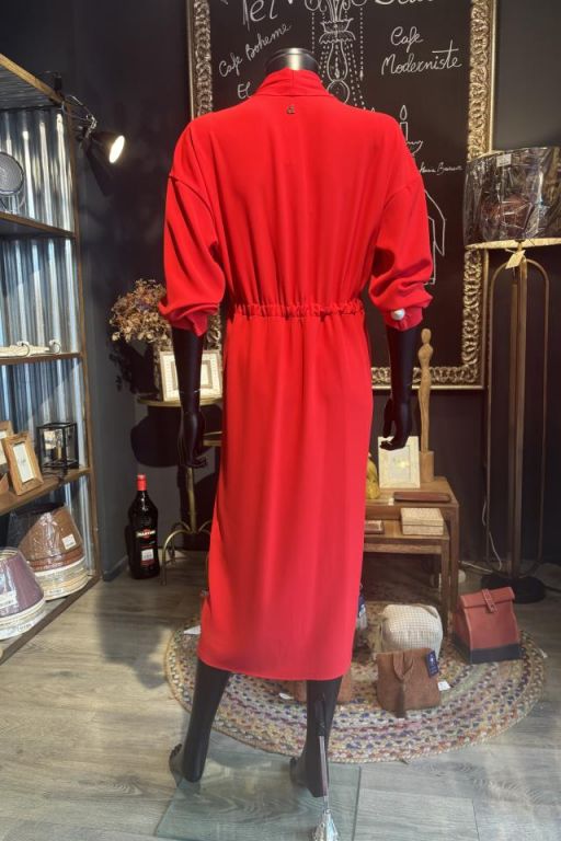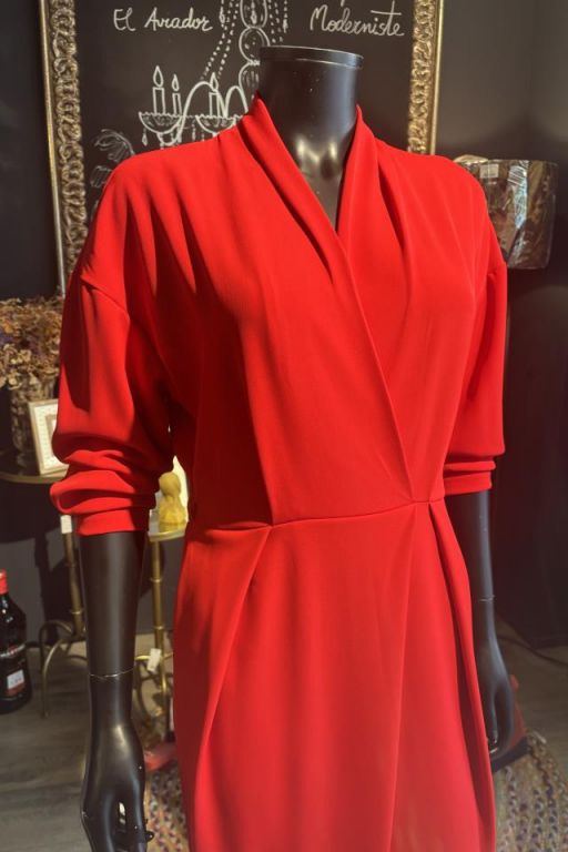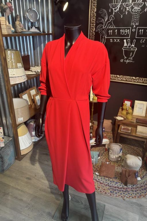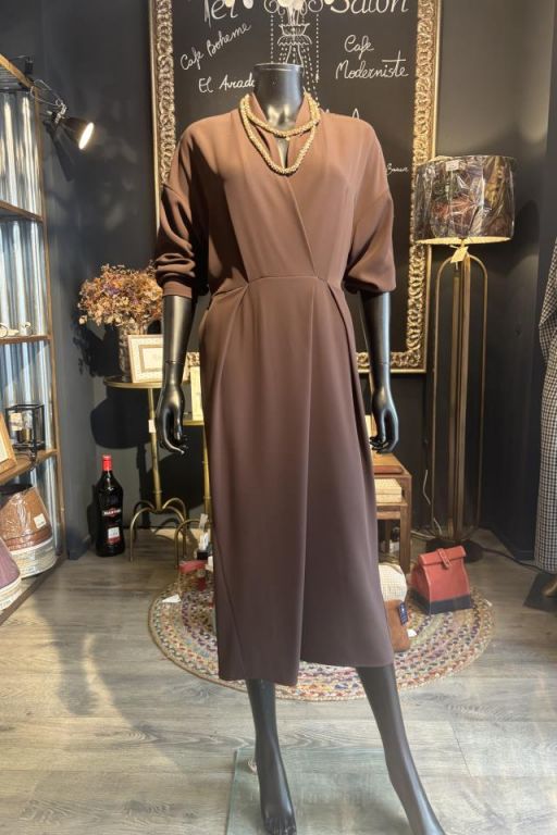 Vestido midi en tejido con caida de cuerpo cruzado y cintura elática trasera