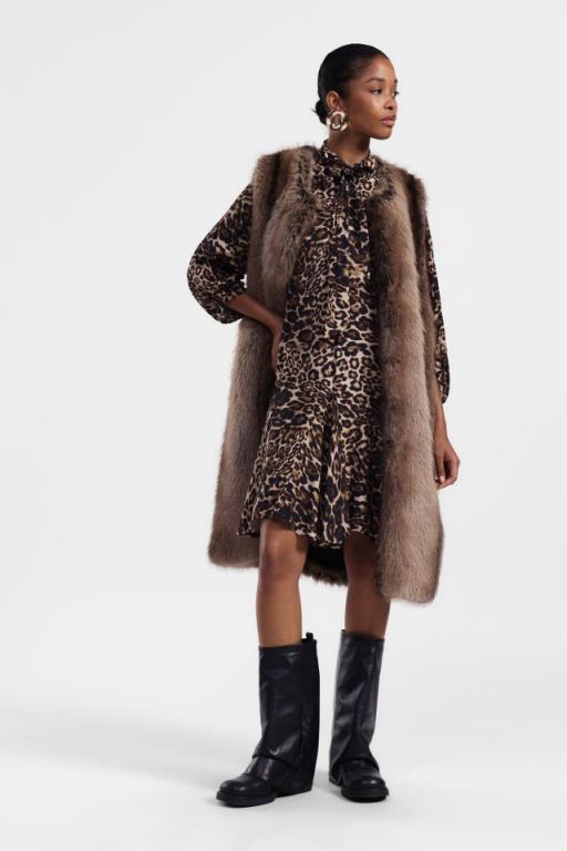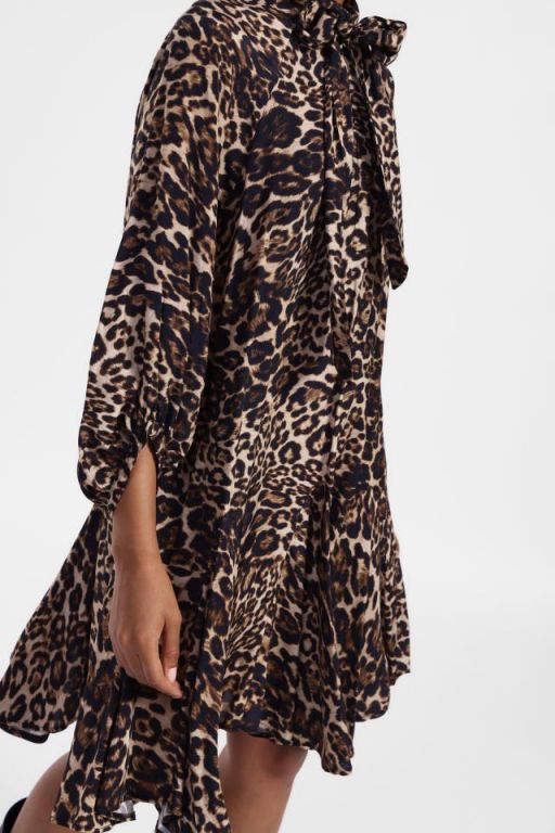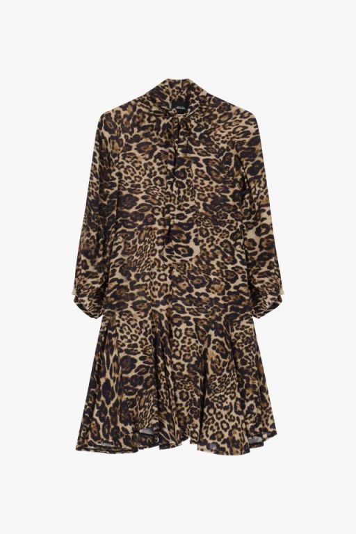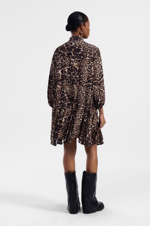 Vestido corto con estampado animal. Mangas 3/4. Cierre de botones delantero aporta un toque práctico y elegante, mientras el escote redondo completa un look versátil para el día a día.
