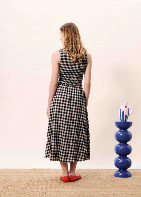 Vestido sin mangas con escote redondo, cintura elástica fruncida, corte acampanado y largo midi. Cierre de botones en la espalda
