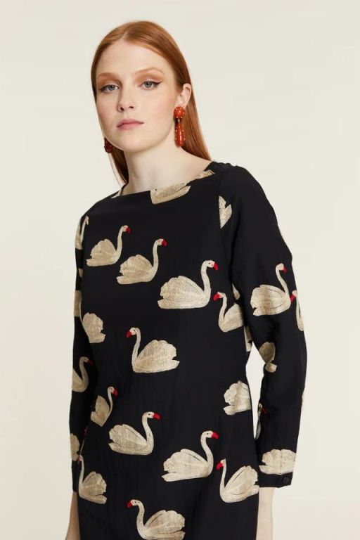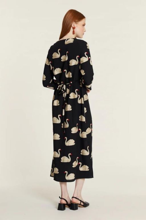 Maxivestido bordado cisnes, mangas largas rectas con puño abotonado, por debajo de la rodilla y anudado en la espalda.