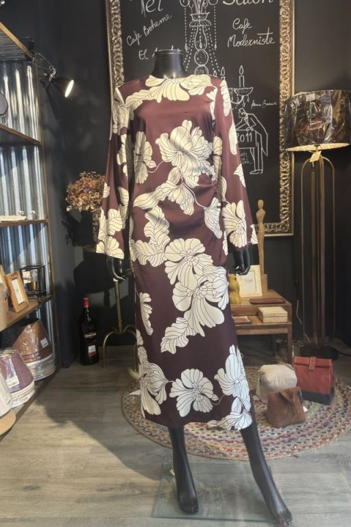 Vestido Second Female con estampado floral. El vestido está confeccionado en una suave y vaporosa mezcla de viscosa con estampado floral integral. Presenta escote redondo y cierre de cremallera oculta en la espalda con tiradores largos de tela. Hombros acolchados y mangas largas. Costura fruncida en un lateral que crea un favorecedor efecto drapeado. Abertura lateral profunda. Corte entallado.