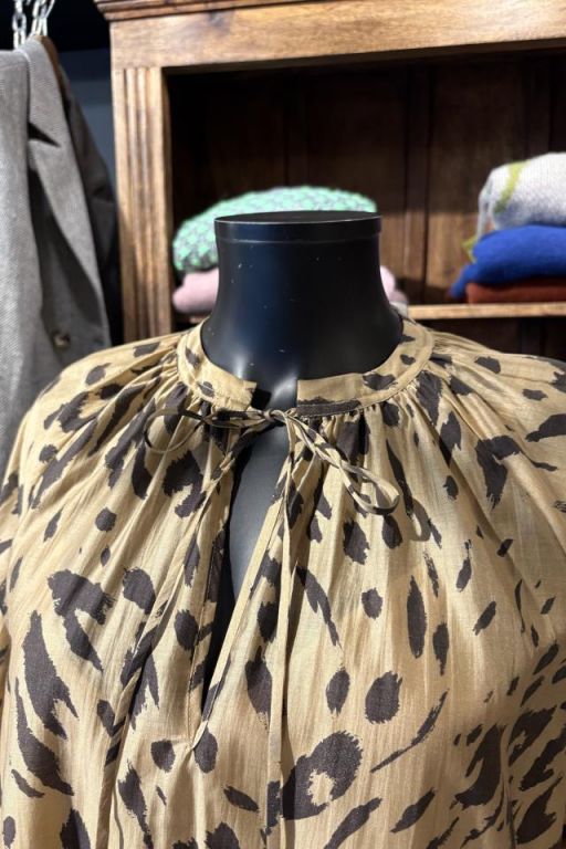 Vestido túnica estampado . El vestido está confeccionado en tela semitransparente y drapeada con estampado integral. Presenta escote redondo con abertura en forma de lágrima y cierre de lazo. Con lencero desmontable. Mangas raglán con puños abotonados. Corte recto y holgado.