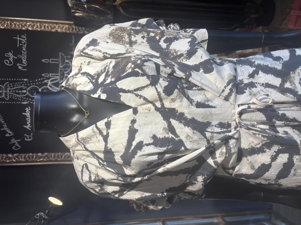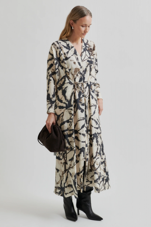 Vestido largo con escote en V. Presenta escote en V y mangas largas y entalladas. Abertura frontal profunda. Lazos finos a los lados que permiten ajustar el vestido para crear una silueta más definida.