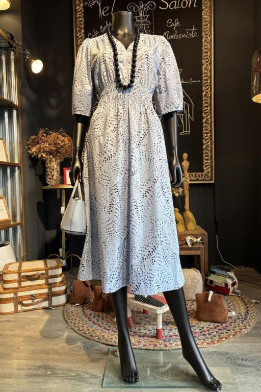 Vestido con cuello de pico, ajustado en cintura por un elástico, largo estándar y mangas abullonadas.