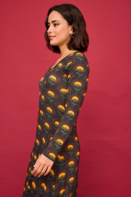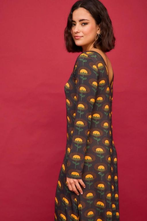 Vestido largo pegado, con más volumen a partir de la cadera.